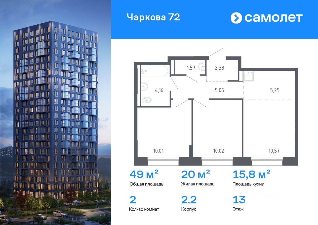Строим кварталы для жизни с заботой о будущем. Предлагается 2-комнатная квартира комфорт-класса 49,01 кв.м в корпусе 2.2 на 13 этаже, в ЖК "Чаркова 72"