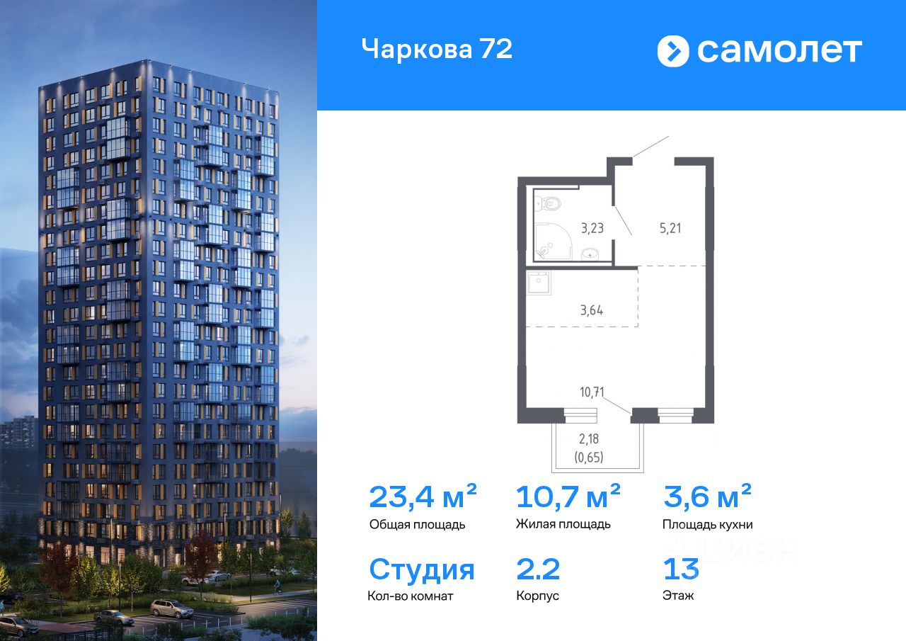 Строим кварталы для жизни с заботой о будущем. Предлагается квартира студия комфорт-класса 23,44 кв.м в корпусе 2.2 на 13 этаже, в ЖК "Чаркова 72"