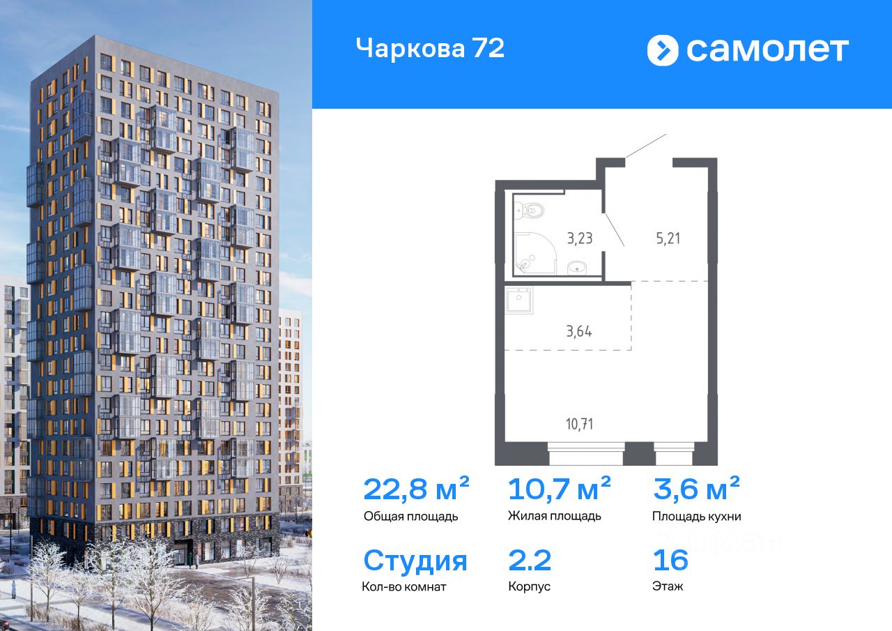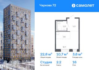Строим кварталы для жизни с заботой о будущем. Предлагается квартира студия комфорт-класса 22,79 кв.м в корпусе 2.2 на 16 этаже, в ЖК "Чаркова 72"