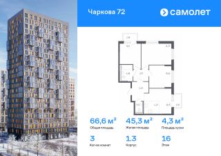 Строим кварталы для жизни с заботой о будущем. Предлагается 3-комнатная квартира комфорт-класса 66,61 кв.м в корпусе 1.3 на 16 этаже, в ЖК "Чаркова 72"