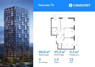 Строим кварталы для жизни с заботой о будущем. Предлагается 3-комнатная квартира комфорт-класса 66,61 кв.м в корпусе 1.3 на 12 этаже, в ЖК "Чаркова 72"