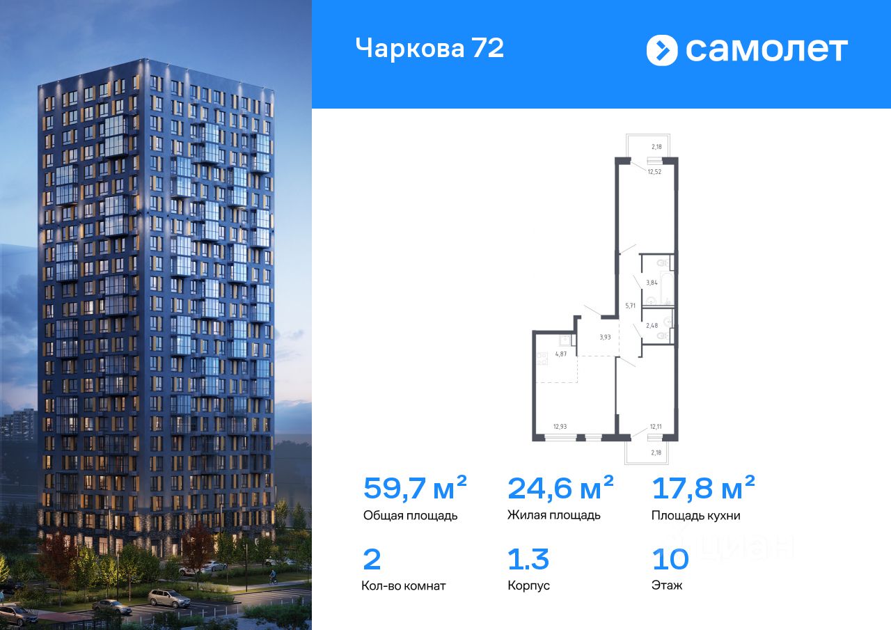 Строим кварталы для жизни с заботой о будущем. Предлагается 2-комнатная квартира комфорт-класса 59,69 кв.м в корпусе 1.3 на 10 этаже, в ЖК "Чаркова 72"