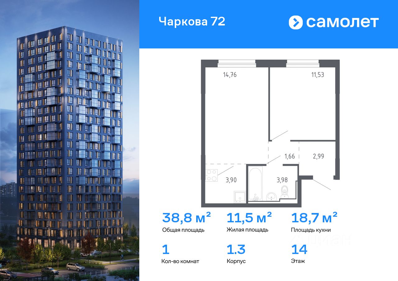 Строим кварталы для жизни с заботой о будущем. Предлагается 1-комнатная квартира комфорт-класса 38,82 кв.м в корпусе 1.3 на 14 этаже, в ЖК "Чаркова 72"