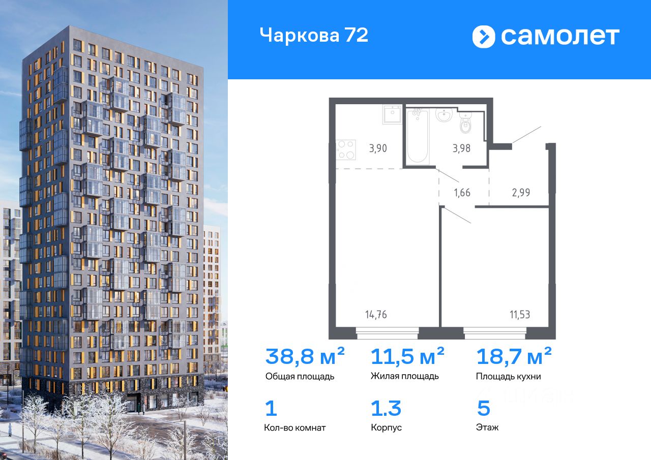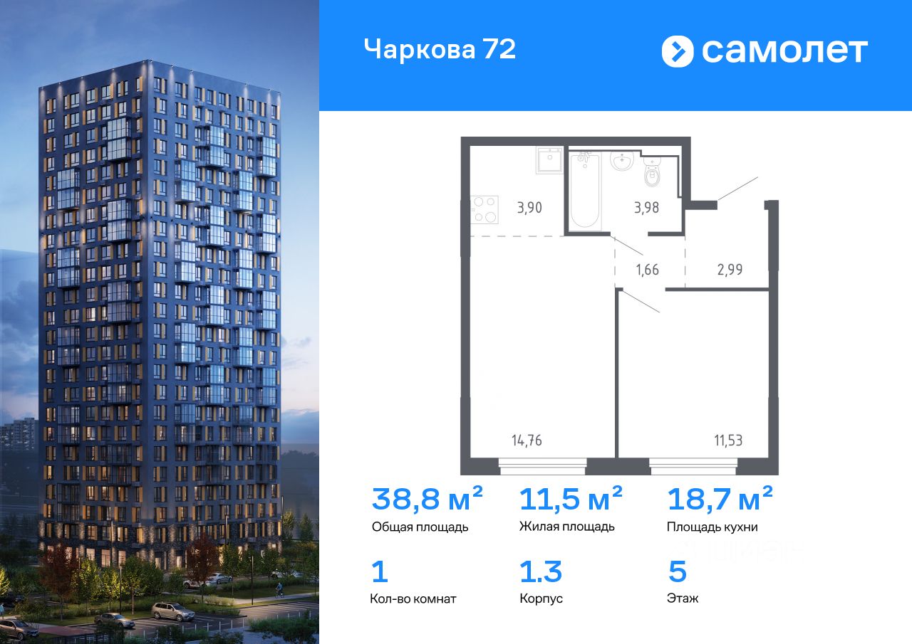 Строим кварталы для жизни с заботой о будущем. Предлагается 1-комнатная квартира комфорт-класса 38,82 кв.м в корпусе 1.3 на 5 этаже, в ЖК "Чаркова 72"