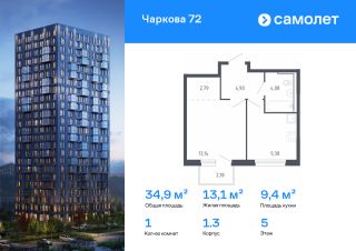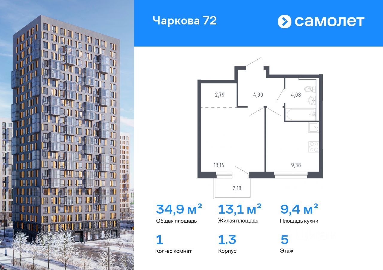 Строим кварталы для жизни с заботой о будущем. Предлагается 1-комнатная квартира комфорт-класса 34,94 кв.м в корпусе 1.3 на 5 этаже, в ЖК "Чаркова 72"