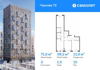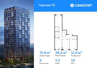 Строим кварталы для жизни с заботой о будущем. Предлагается 3-комнатная квартира комфорт-класса 71,55 кв.м в корпусе 1.3 на 15 этаже, в ЖК "Чаркова 72"