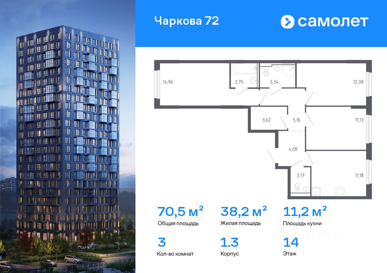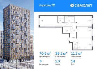 Строим кварталы для жизни с заботой о будущем. Предлагается 3-комнатная квартира комфорт-класса 70,47 кв.м в корпусе 1.3 на 14 этаже, в ЖК "Чаркова 72"