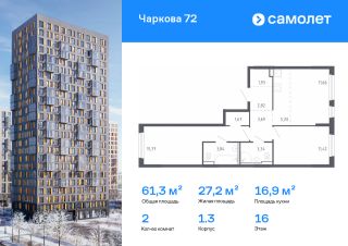 Строим кварталы для жизни с заботой о будущем. Предлагается 2-комнатная квартира комфорт-класса 61,34 кв.м в корпусе 1.3 на 16 этаже, в ЖК "Чаркова 72"