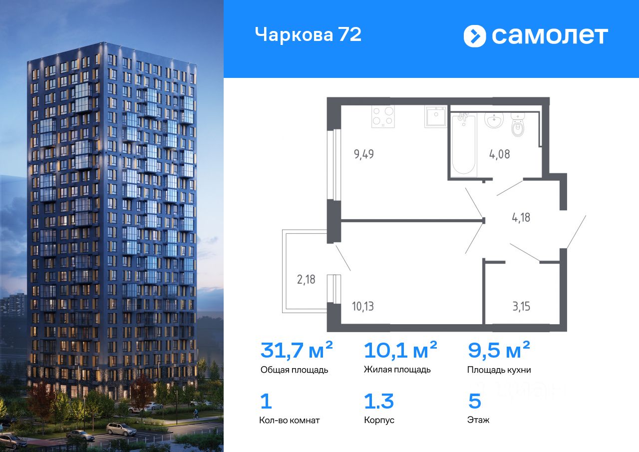 Строим кварталы для жизни с заботой о будущем. Предлагается 1-комнатная квартира комфорт-класса 31,68 кв.м в корпусе 1.3 на 5 этаже, в ЖК "Чаркова 72"