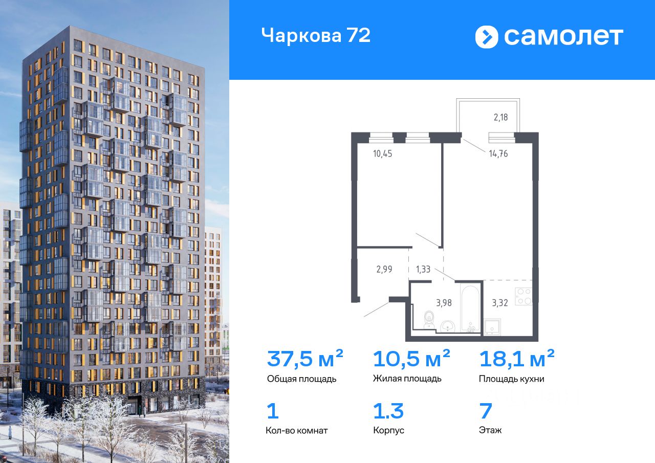 Строим кварталы для жизни с заботой о будущем. Предлагается 1-комнатная квартира комфорт-класса 37,48 кв.м в корпусе 1.3 на 7 этаже, в ЖК "Чаркова 72"