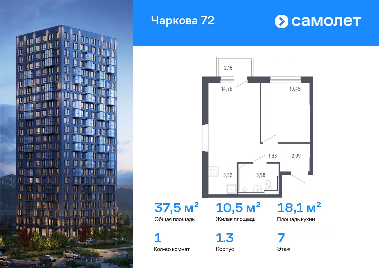 Строим кварталы для жизни с заботой о будущем. Предлагается 1-комнатная квартира комфорт-класса 37,48 кв.м в корпусе 1.3 на 7 этаже, в ЖК "Чаркова 72"