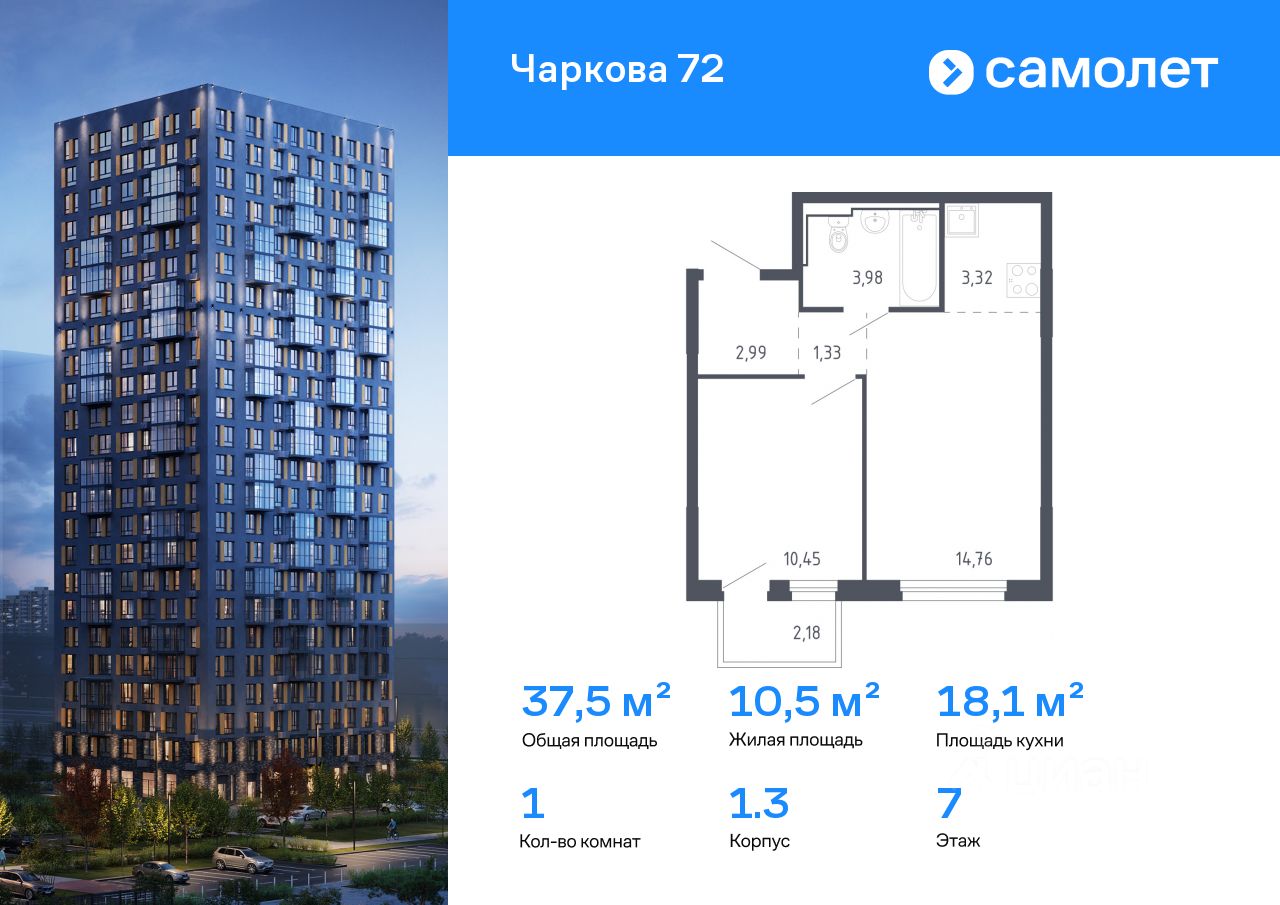 Строим кварталы для жизни с заботой о будущем. Предлагается 1-комнатная квартира комфорт-класса 37,48 кв.м в корпусе 1.3 на 7 этаже, в ЖК "Чаркова 72"