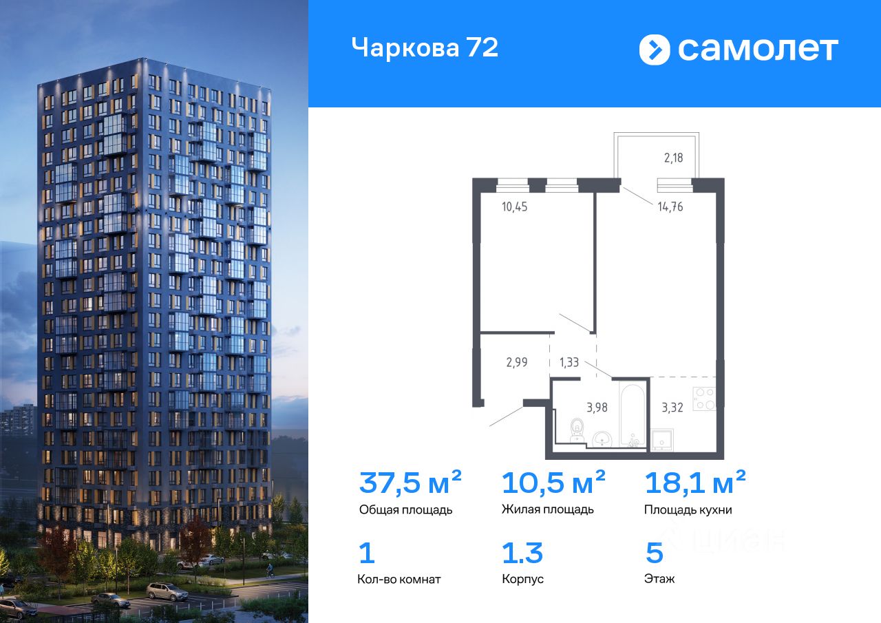 Строим кварталы для жизни с заботой о будущем. Предлагается 1-комнатная квартира комфорт-класса 37,48 кв.м в корпусе 1.3 на 5 этаже, в ЖК "Чаркова 72"