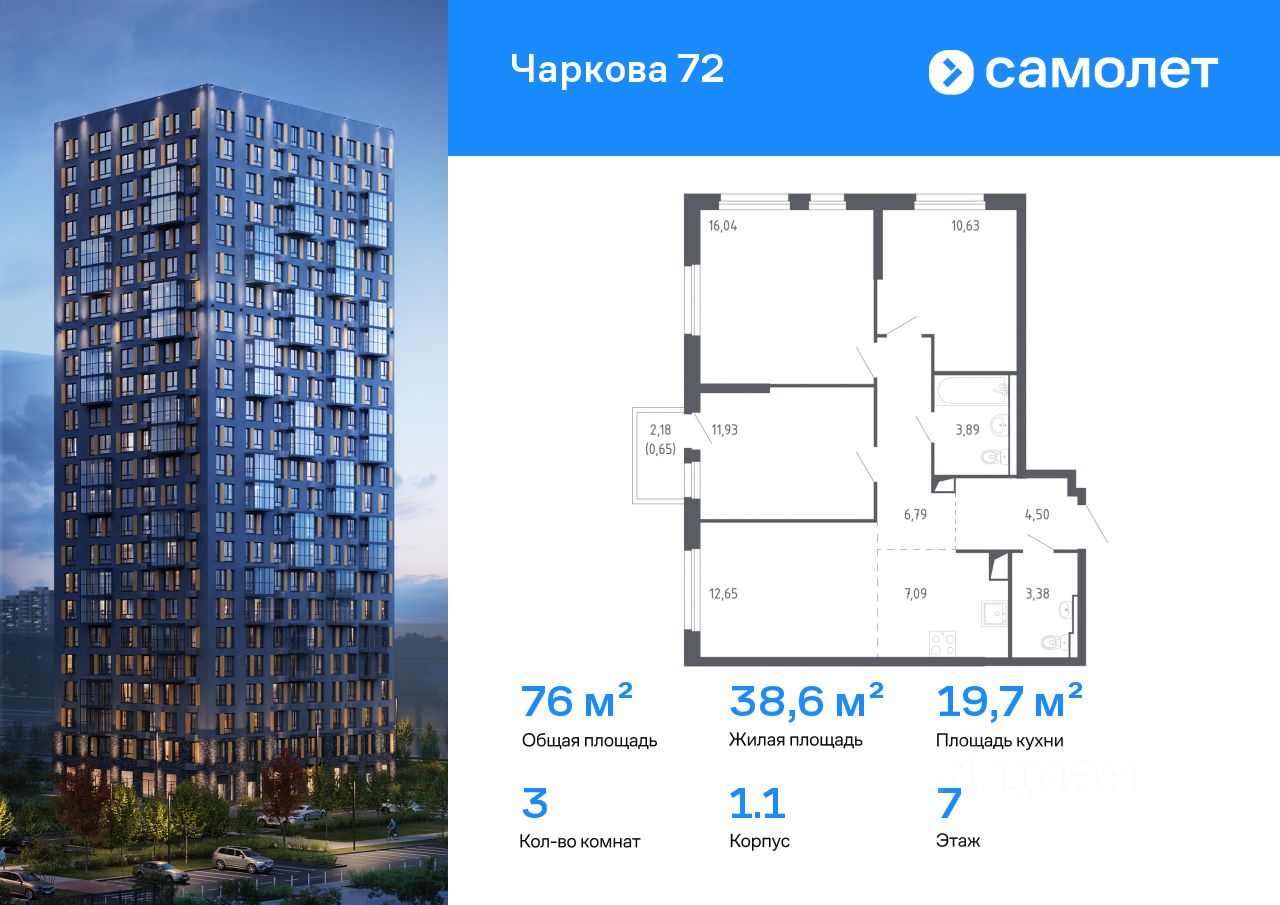 Строим кварталы для жизни с заботой о будущем. Предлагается 3-комнатная квартира комфорт-класса 76 кв.м в корпусе 1.1 на 7 этаже, в ЖК "Чаркова 72"
