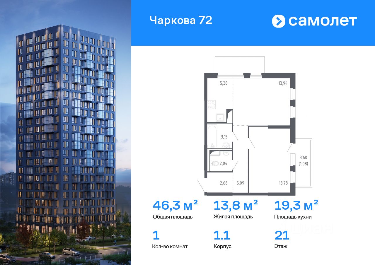 Строим кварталы для жизни с заботой о будущем. Предлагается 1-комнатная квартира комфорт-класса 46,3 кв.м в корпусе 1.1 на 21 этаже, в ЖК "Чаркова 72"