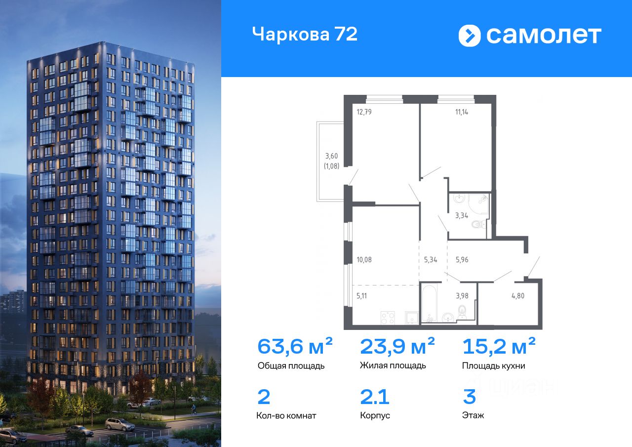Строим кварталы для жизни с заботой о будущем. Предлагается 2-комнатная квартира комфорт-класса 63,62 кв.м в корпусе 2.1 на 3 этаже, в ЖК "Чаркова 72"