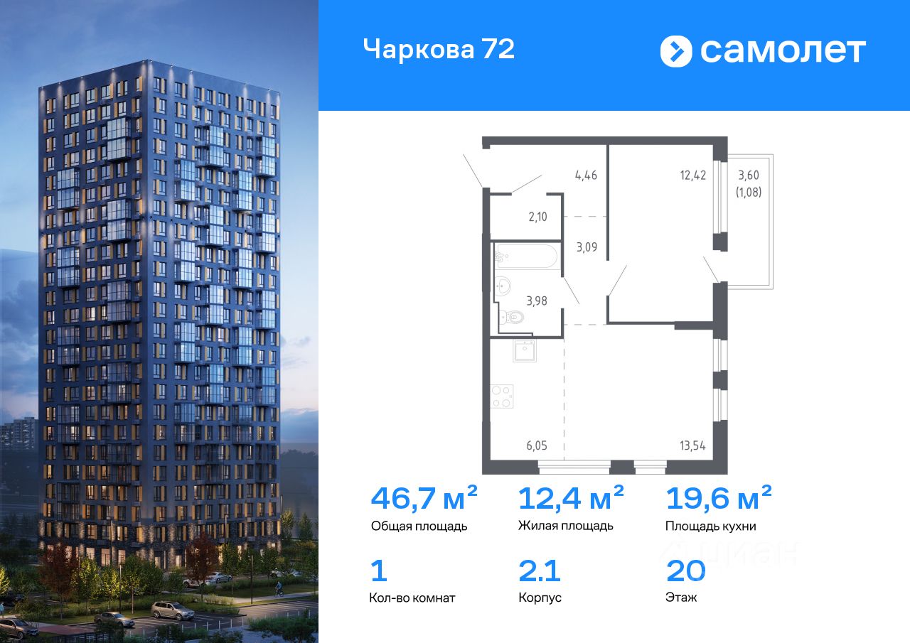 Строим кварталы для жизни с заботой о будущем. Предлагается 1-комнатная квартира комфорт-класса 46,72 кв.м в корпусе 2.1 на 20 этаже, в ЖК "Чаркова 72"