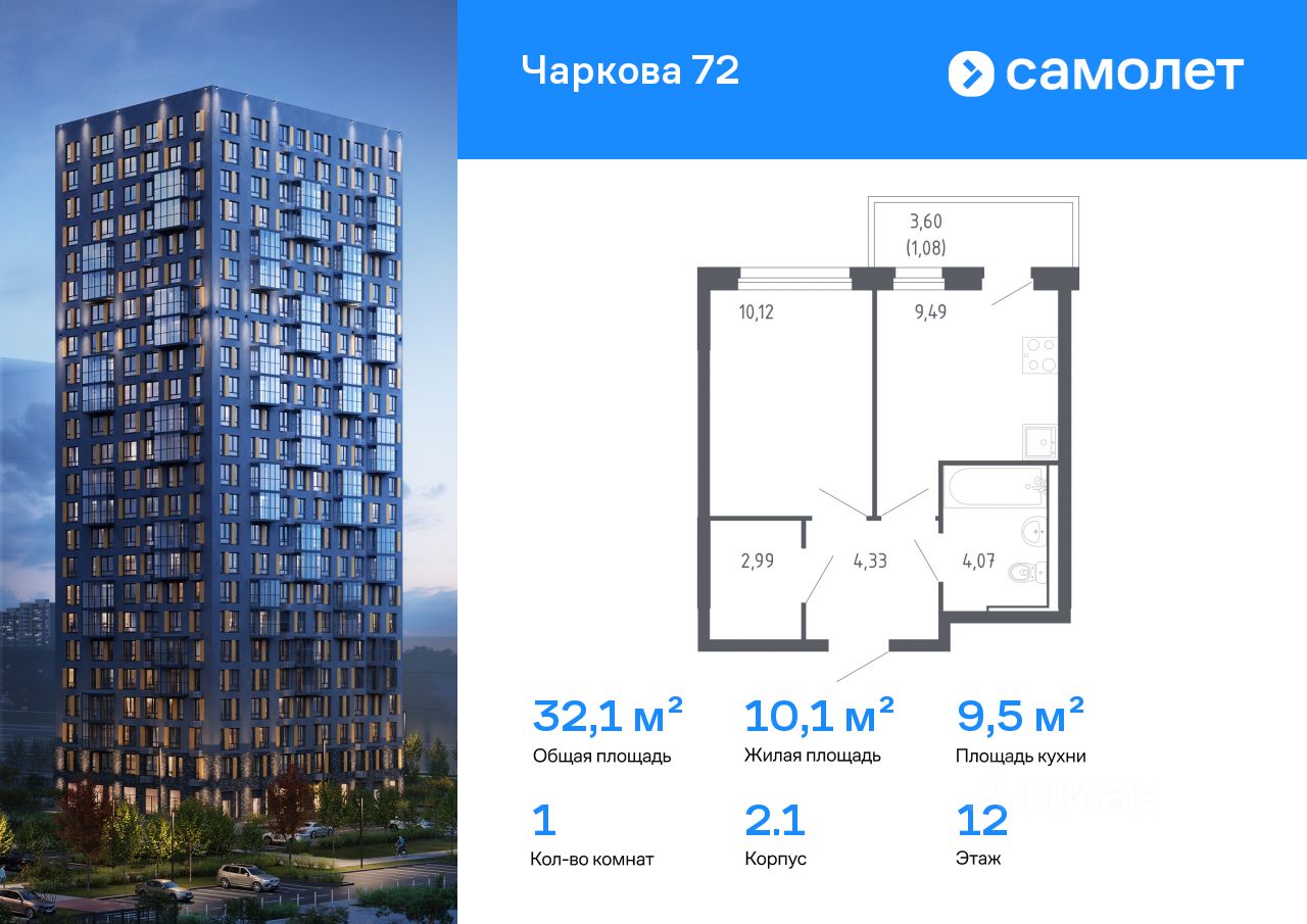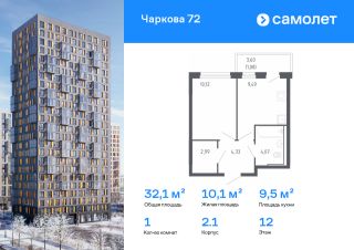 Строим кварталы для жизни с заботой о будущем. Предлагается 1-комнатная квартира комфорт-класса 32,08 кв.м в корпусе 2.1 на 12 этаже, в ЖК "Чаркова 72"