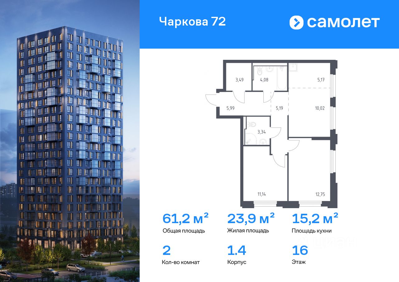 Строим кварталы для жизни с заботой о будущем. Предлагается 2-комнатная квартира комфорт-класса 61,17 кв.м в корпусе 1.4 на 16 этаже, в ЖК "Чаркова 72"