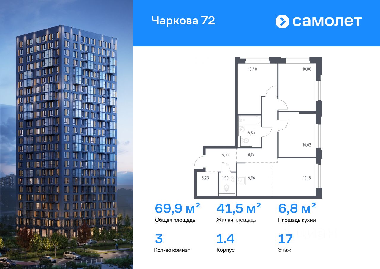 Строим кварталы для жизни с заботой о будущем. Предлагается 3-комнатная квартира комфорт-класса 69,94 кв.м в корпусе 1.4 на 17 этаже, в ЖК "Чаркова 72"