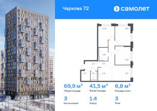 Строим кварталы для жизни с заботой о будущем. Предлагается 3-комнатная квартира комфорт-класса 69,1 кв.м в корпусе 1.4 на 3 этаже, в ЖК "Чаркова 72"