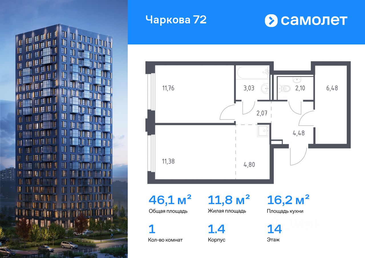 Строим кварталы для жизни с заботой о будущем. Предлагается 1-комнатная квартира комфорт-класса 46,1 кв.м в корпусе 1.4 на 14 этаже, в ЖК "Чаркова 72"