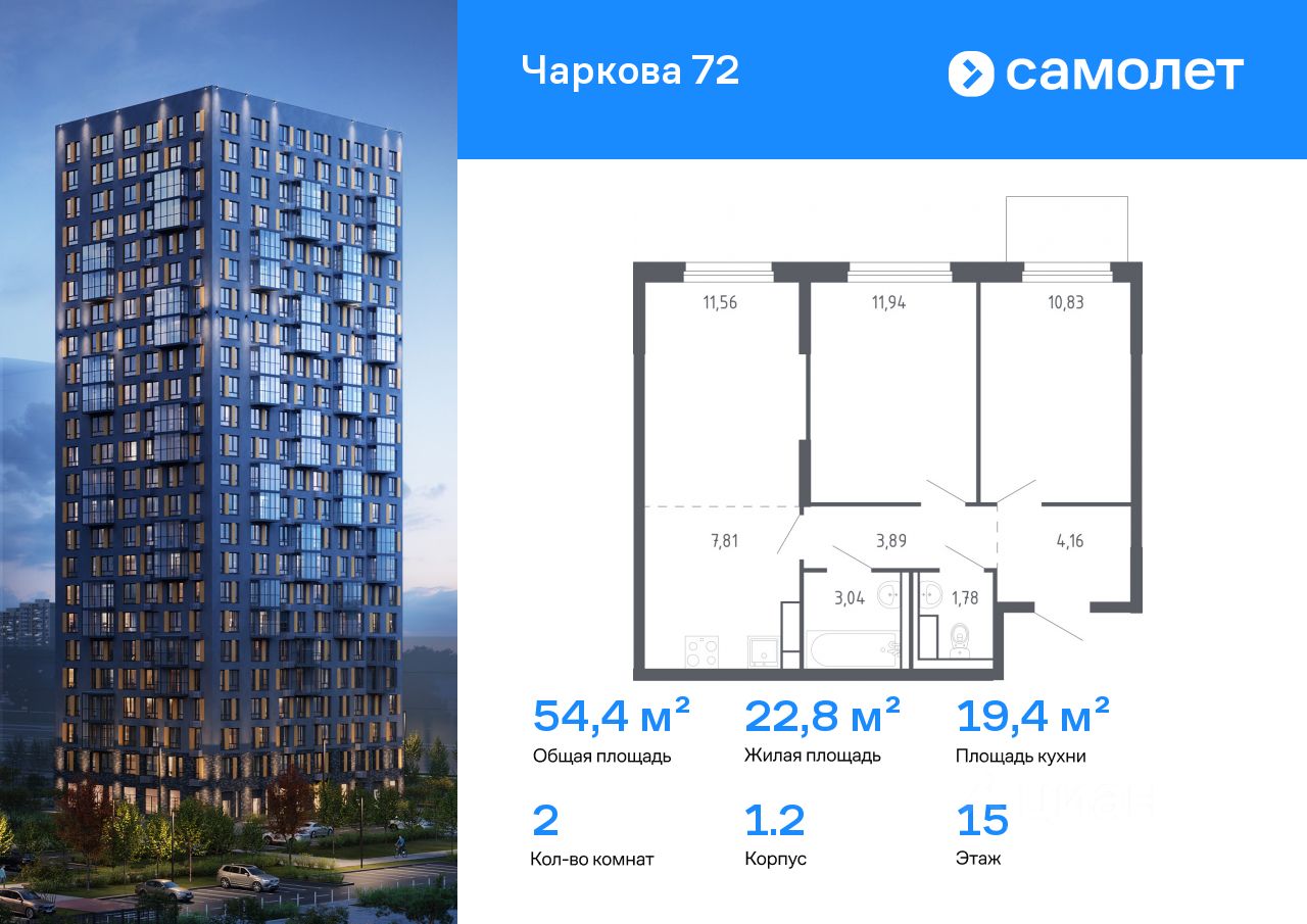 Строим кварталы для жизни с заботой о будущем. Предлагается 2-комнатная квартира комфорт-класса 54,4 кв.м в корпусе 1.2 на 15 этаже, в ЖК "Чаркова 72"