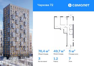 Строим кварталы для жизни с заботой о будущем. Предлагается 3-комнатная квартира комфорт-класса 76,4 кв.м в корпусе 1.2 на 7 этаже, в ЖК "Чаркова 72"