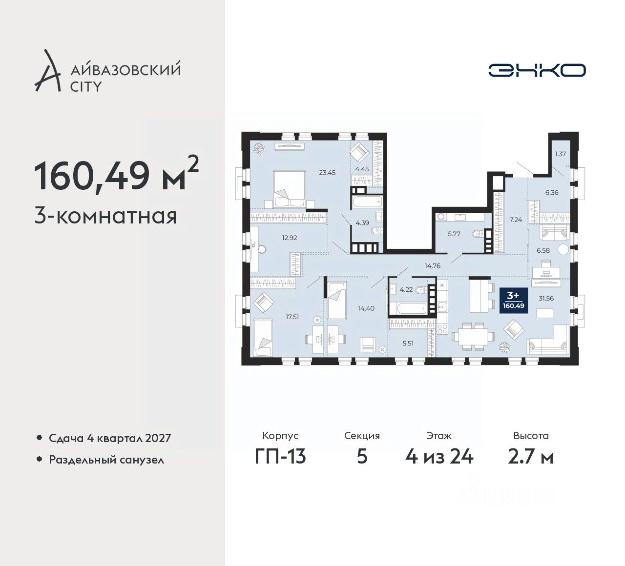 3-комн. квартира в ЖК "Айвазовский City" на 4 этаже. Общая площадь: 160.49 кв.м. Высота потолков 2.7 м.