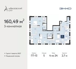 3-комн. квартира с предчистовой отделкой в ЖК "Айвазовский City" на 4 этаже. Общая площадь: 160.49 кв.м., жилая: 55.36 кв.м., площадь просторной кухни-столовой: 31.56 кв.м. Квартира без проходных комнат, окна выходят нa три cтopoны дома. В квартире два совмещенных санузла. Высота потолков 2.7 м.
