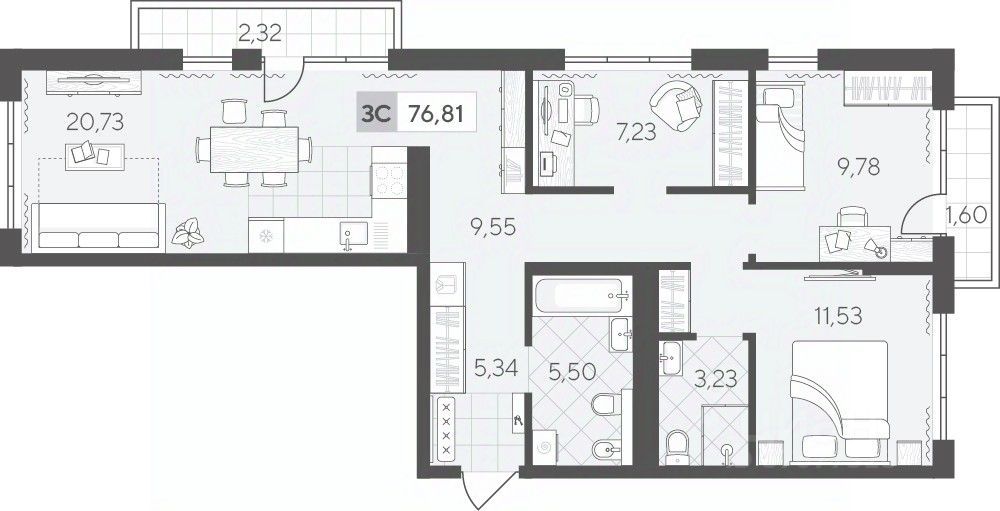 Просторная трёхкомнатная квартира 76.81 кв.м на 3 этаже. Светлые комнаты, удобная планировка и уютная атмосфера создают пространство для жизни. Место притяжения для всей семьи - кухня-гостиная, где комфортно проводить время с семьей или принимать гостей.
