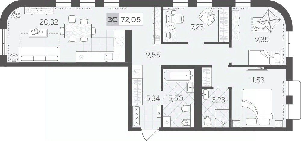 Трёхкомнатная квартира 72.05 кв.м на 8 этаже — отличный выбор для семьи. Большая часть квартиры отведена под личное пространство и включает 3 просторные спальни.