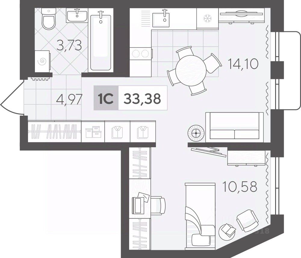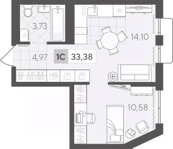 Однокомнатная квартира 33.38 кв.м на 8 этаже с просторной кухней-гостиной. Здесь легко создать уютное пространство для встреч, а отдельная спальня обеспечивает комфорт и личное пространство..