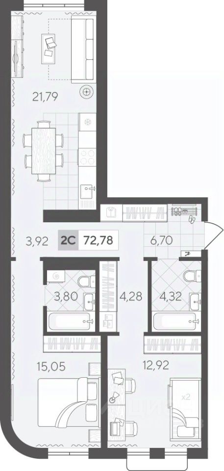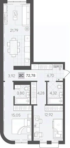 Квартира с двумя спальнями площадью 72.78 кв.м на 6 этаже с продуманной планировкой. Площадь квартиры условно разделена на гостевую зону и личное пространство только для вас и вашей семьи.
