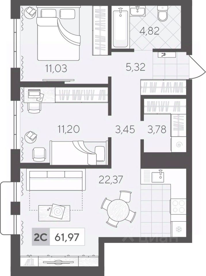 Квартира с двумя спальнями площадью 61.97 кв.м на 7 этаже с продуманной планировкой. Площадь квартиры условно разделена на гостевую зону и личное пространство только для вас и вашей семьи.