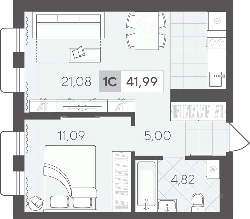 Однокомнатная квартира 41.99 кв.м на 8 этаже с просторной кухней-гостиной. Здесь легко создать уютное пространство для встреч, а отдельная спальня обеспечивает комфорт и личное пространство..