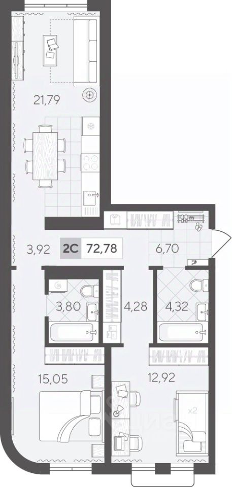 Квартира с двумя спальнями площадью 72.78 кв.м на 8 этаже. Продуманная геометрия комнат позволит легко зонировать пространство для личного досуга и места, где удобно проводить время с семьей или встречать гостей.
