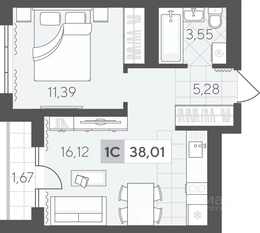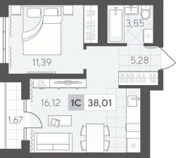 Однокомнатная квартира 38.01 кв.м на 2 этаже с продуманной планировкой. Просторная кухня-гостиная идеально подходит для приёма гостей, а уютная спальня станет личным местом отдыха.