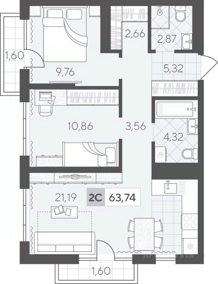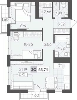 Двухкомнатная квартира 63.74 кв.м на 5 этаже — это удобное пространство для комфортной жизни. Отдельные спальни позволят каждому члену семьи иметь личное пространство. В кухне-гостиной комфортно вместе готовить, проводить семейные ужины или настольные игры с друзьями.