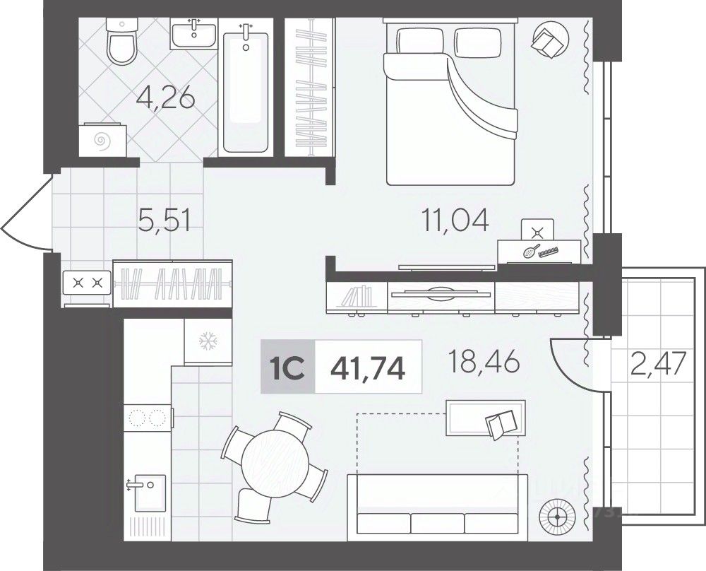 Однокомнатная квартира 41.74 кв.м на 6 этаже с продуманной планировкой. Просторная кухня-гостиная идеально подходит для приёма гостей, а уютная спальня станет личным местом отдыха.
