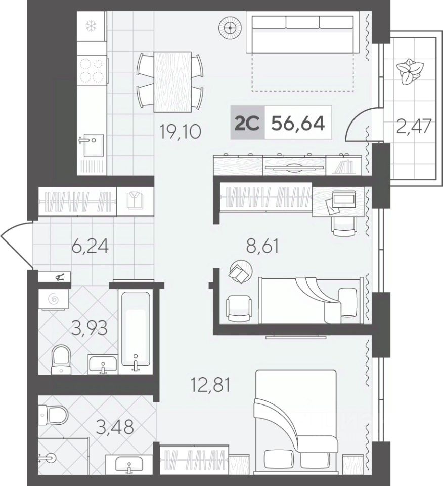 Двухкомнатная квартира 56.64 кв.м на 10 этаже — идеальный вариант для молодой семьи или пары. Просторная кухня-гостиная станет местом семейных встреч, а две спальни обеспечат удобство и приватность для каждого.