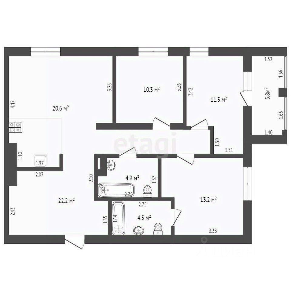 Основой пространства служит большая кухня-гостиная, объединенная с открытым балконом, что создает удобную зону для отдыха и приема гостей. Особенностью планировки является мастер-спальня с собственной ванной комнатой, обеспечивающая приватность. Две другие комнаты правильной формы, подходящие для детской, кабинета или гостевой комнаты.