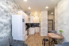 Планировка евроформата с кухней-гостиной, потолки 3 м. Высота окон 1.7м, горизонтальная система отопления, разводка труб скрыта в пол.