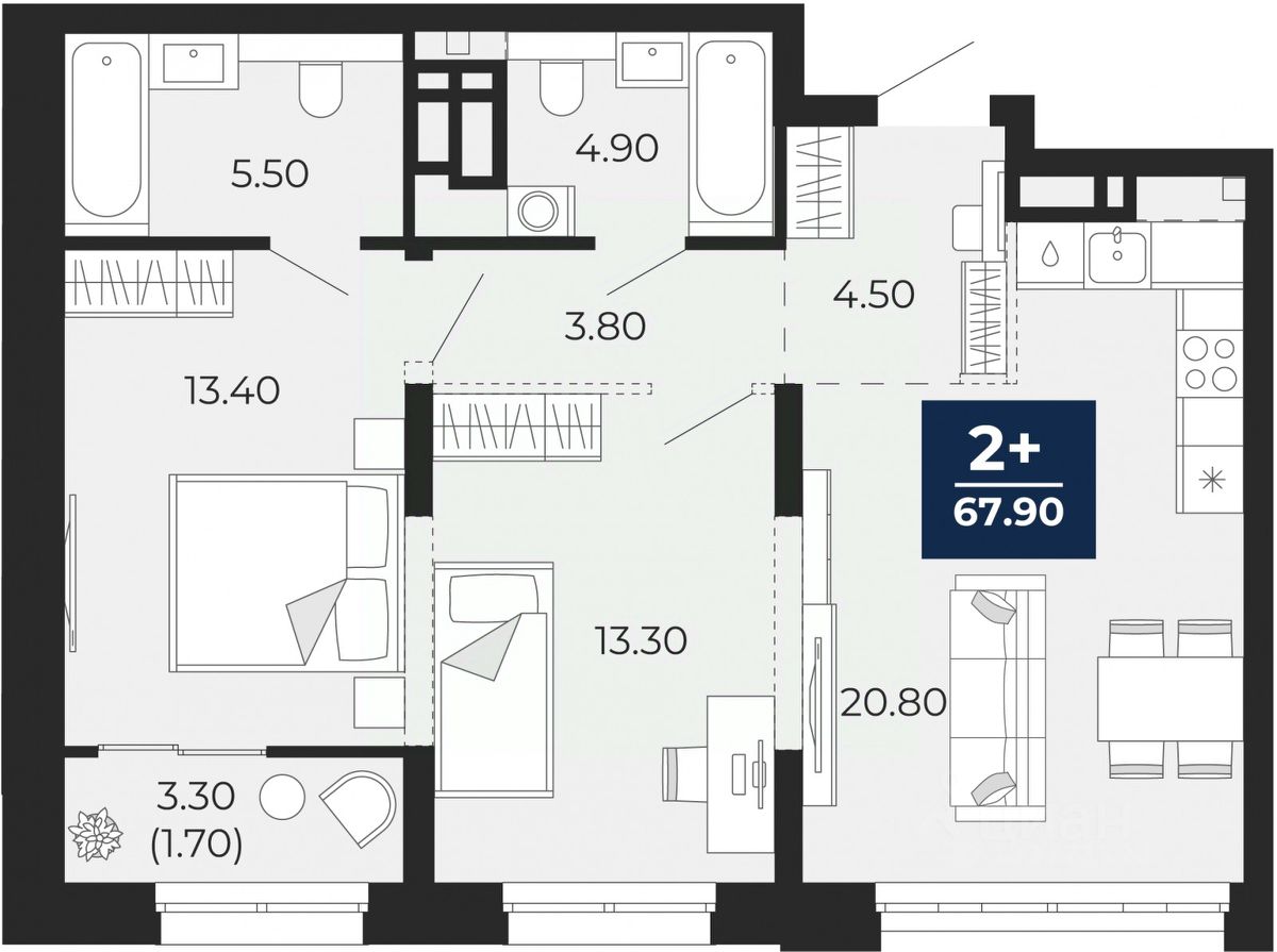 2-комн. квартира с предчистовой отделкой в ЖК "Айвазовский City" на 12 этаже. Общая площадь: 67.9 кв.м., жилая: 26.7 кв.м., площадь просторной кухни-столовой: 20.8 кв.м. Комнаты изолированные, все окна выходят на одну сторону. В квартире одна лоджия, два совмещенных санузла. Высота потолков 2.72 м.