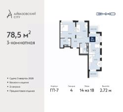 Трехкомнатная квартира от застройщика с предчистовой отделкой в ЖК "Айвазовский City" на 14 этаже. Общая площадь: 78.5 кв.м., жилая: 41.7 кв.м., площадь просторной кухни-столовой: 15.7 кв.м. Квартира без проходных комнат, окна выходят нa три cтopoны дома. В квартире один балкон и одна лоджия, два совмещенных санузла. Высота потолков 2.72 м.