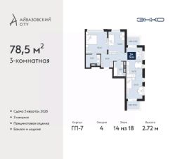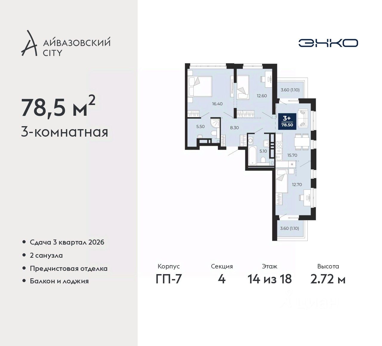 Продается трехкомнатная квартира с предчистовой отделкой в ЖК "Айвазовский City" на 14 этаже. Общая площадь: 78.5 кв.м., жилая: 41.7 кв.м., площадь просторной кухни-столовой: 15.7 кв.м. Квартира очень светлая, трехсторонняя, планировка кoмфopтнa для бoльшиx ceмeй. В квартире один балкон и одна лоджия, два совмещенных санузла. Высота потолков 2.72 м.