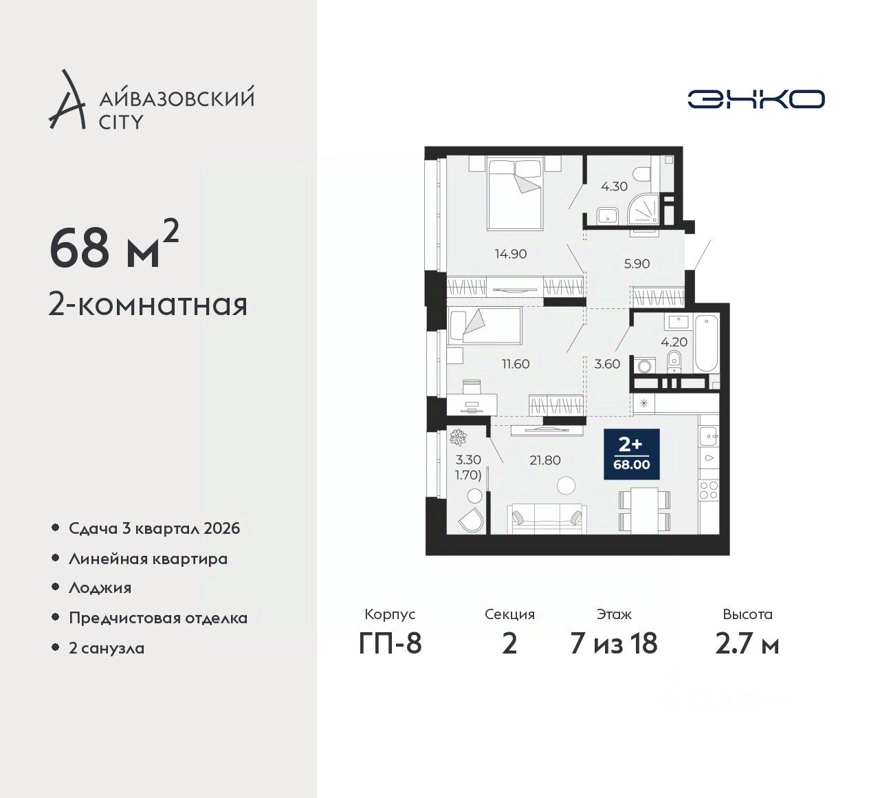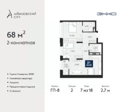 2-комн. квартира от застройщика с предчистовой отделкой в ЖК "Айвазовский City" на 7 этаже. Общая площадь: 68 кв.м., жилая: 26.5 кв.м., площадь просторной кухни-столовой: 21.8 кв.м. Комнаты изолированные, все окна выходят на одну сторону. В квартире одна лоджия, два совмещенных санузла. Высота потолков 2.7 м.