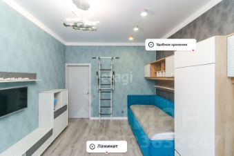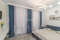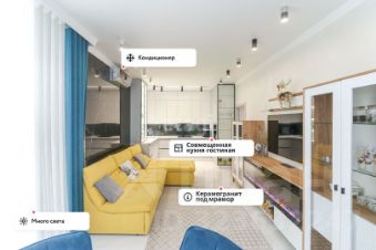Кухня-гостиная оборудована гарнитуром со встроенной техникой Bosch (варочная панель, духовой шкаф, посудомоечная машина), которая остается в подарок новым владельцам. Зона отдыха с подсветкой позволяет регулировать атмосферу в помещении. Гардеробная система в прихожей обеспечивает удобное хранение вещей.