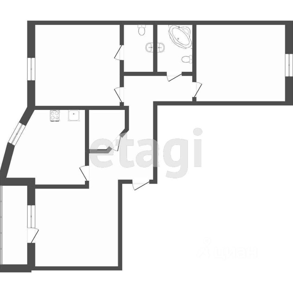 Планировка: кухня, 3 изолированные комнаты правильной формы и 2 санузла.
