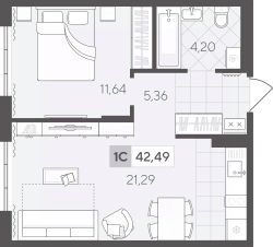 Однокомнатная квартира 42.49 кв.м на 3 этаже с планировкой, сочетающей комфорт и функциональность. Здесь легко создать атмосферу уюта и спокойствия, а кухня-гостиная позволит проводить много времени за совместными занятиями или принимать гостей.